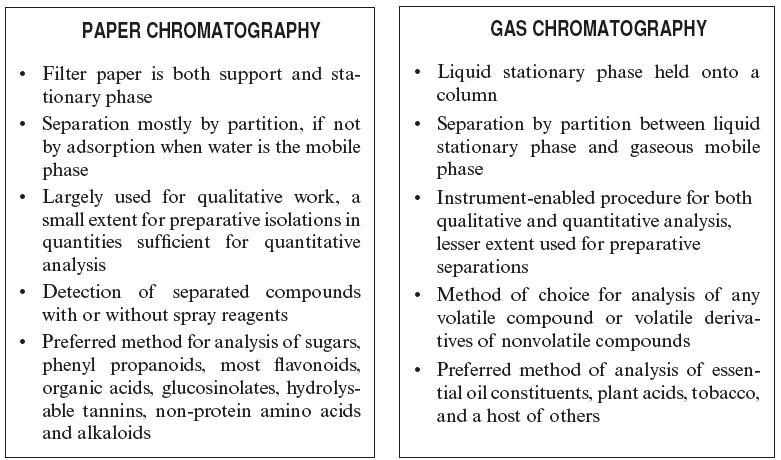 Chromatography refers to a broad range of physical methods for the separation and/or analysis of complex mixtures of compounds. Plant drugs being constituted of multitudes of phytochemical groups, chromatographic techniques find immense application in their separation, processing, purification, and in qualitative and quantitative analysis. Developments in the field of chromatography have facilitated parallel rapid advancement in our understanding of complex phytochemical profiles of valuable plant drugs. It has been one of the most useful techniques of general application not only to the field of phytochemical analysis, but also to a host of other biochemical processing sectors requiring rapid and efficient resolution of complex mixtures of chemicals.