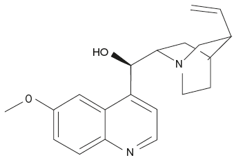 Quinine is a natural white crystalline, odourless alkaloid readily soluble in ether and chloroform. Slightly soluble in water, it is also soluble in alcohol, carbon disulphide and glycerol. Intensely bitter to taste, its molecular formula is C20H24N2O2 and has a melting point of 173–175°C. Being a diacidic base, it forms both acid and neutral salt. While neutral salts are formed by the involvement of tertiary N atom in the quinnuclidine ring, acid salts are formed by the involvement of both the nitrogen atoms.