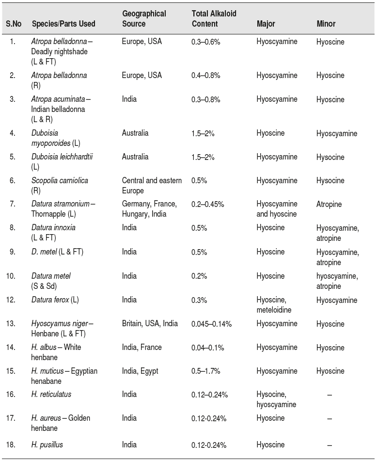 Out of 72 genera of the family Solanaceae, only eight genera namely Atropa, Hysocyamus, Scopolia, Mandrogora, Physochlaina, Datura, Solandra and Duboisia contain atropine, hyoscyamine and hysocine. The species under these genera can be classified into three categories: